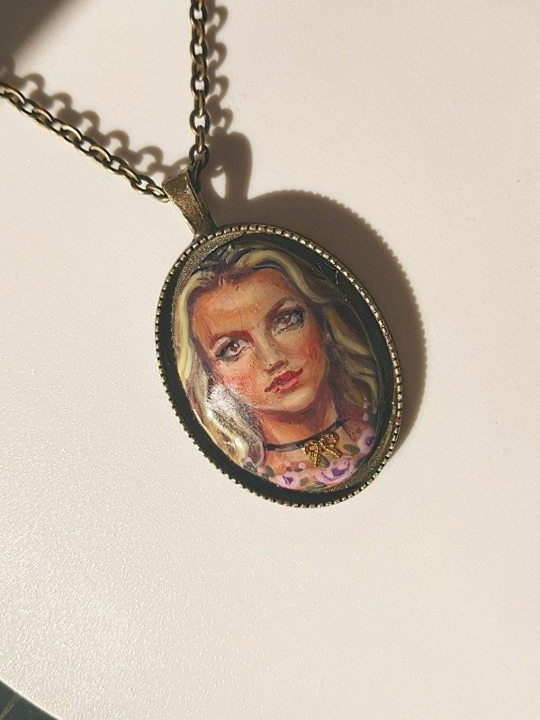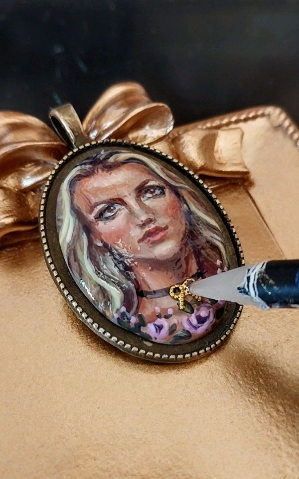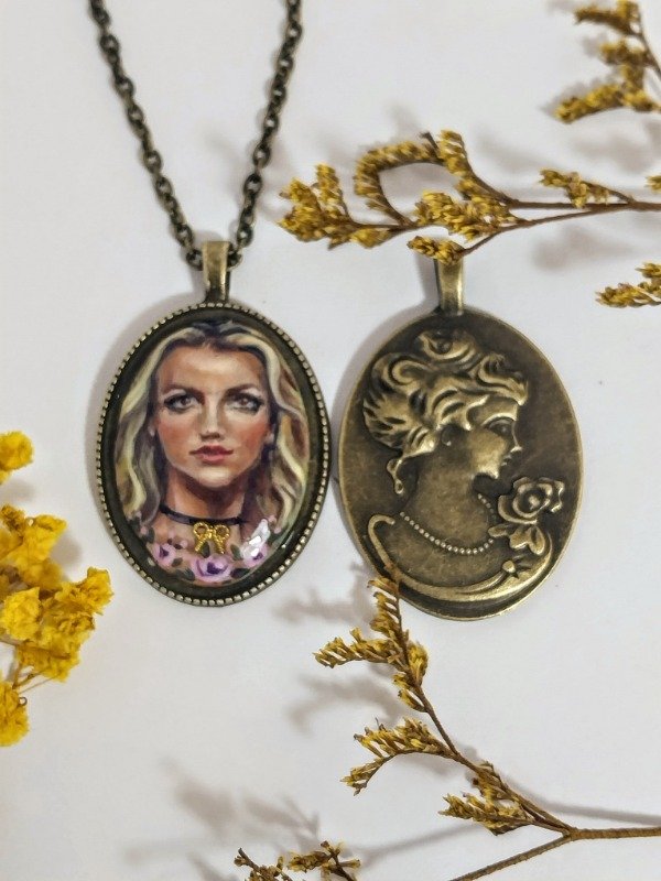 Retrato de Britney Spears pintado a mano en micropintura sobre base de camafeo. Imagen con relieve en dorso.