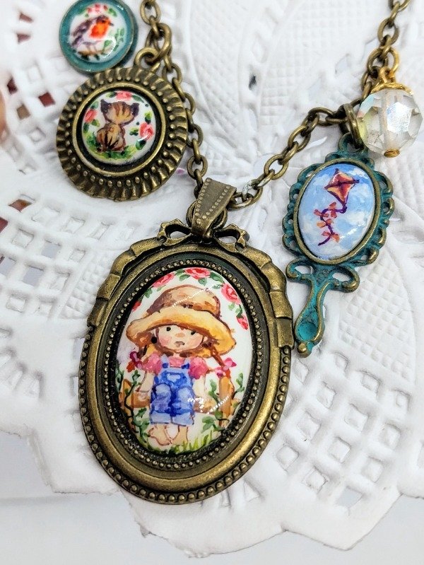 Camafeo de base importada con pequeños dijes micropintados a mano, temática Sarah Kay. Incluye cadenita larga color bronce
